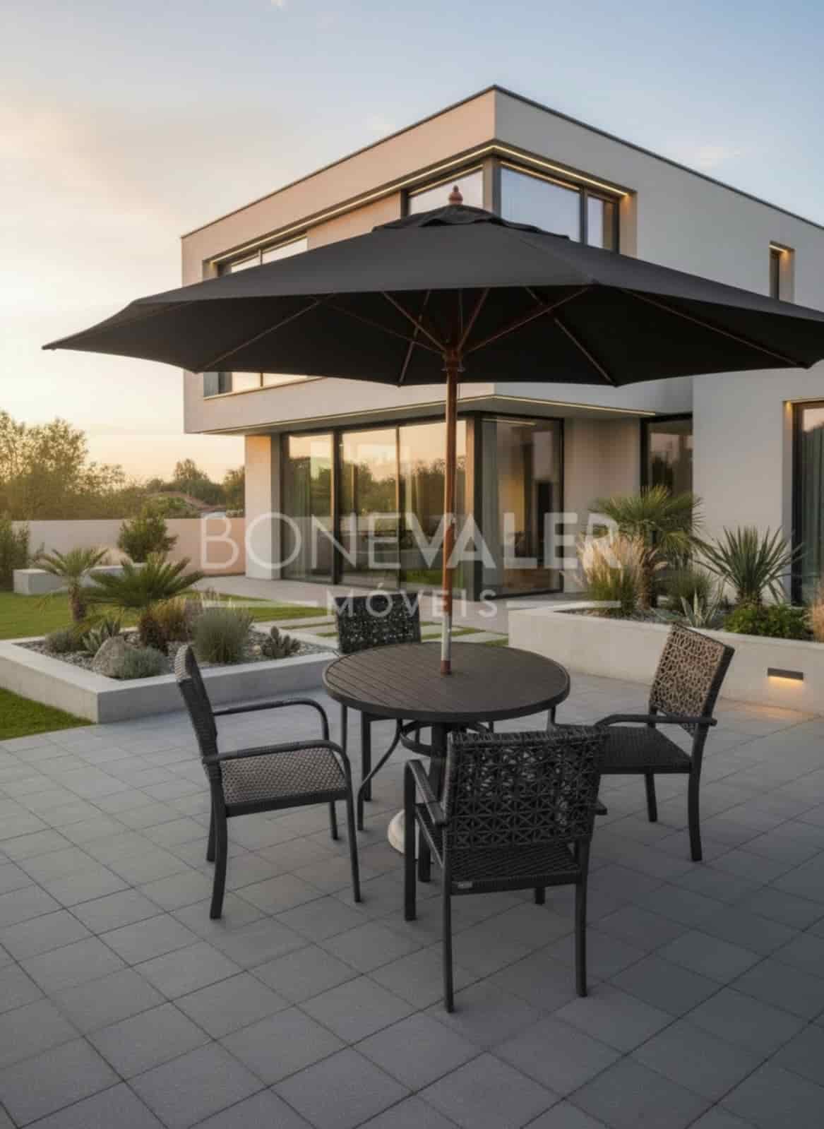 A mesa possui uma opção prática de guarda-sol no centro, ideal para dias ensolarados. A bela trama das poltronas e da mesa adiciona um toque sofisticado ao design, garantindo conforto e estilo.