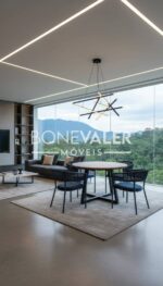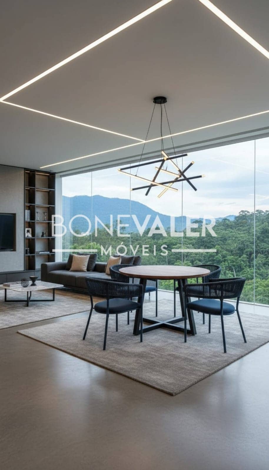 A mesa com tampo em madeira ripada complementa o conjunto com um toque natural e refinado, criando contraste perfeito entre textura e estrutura, e elevando ainda mais a estética do ambiente.