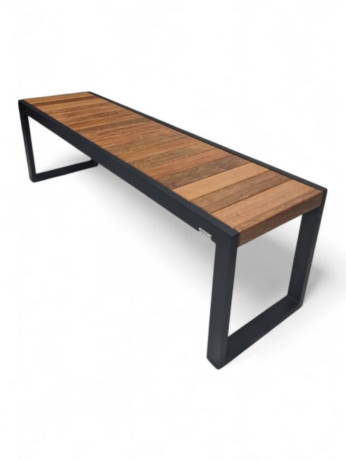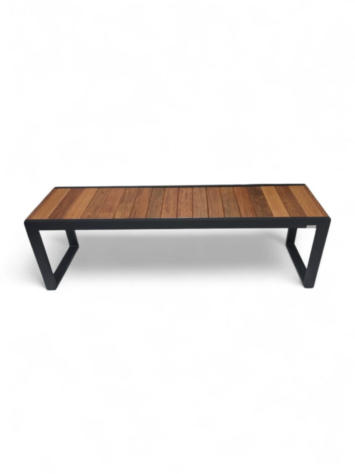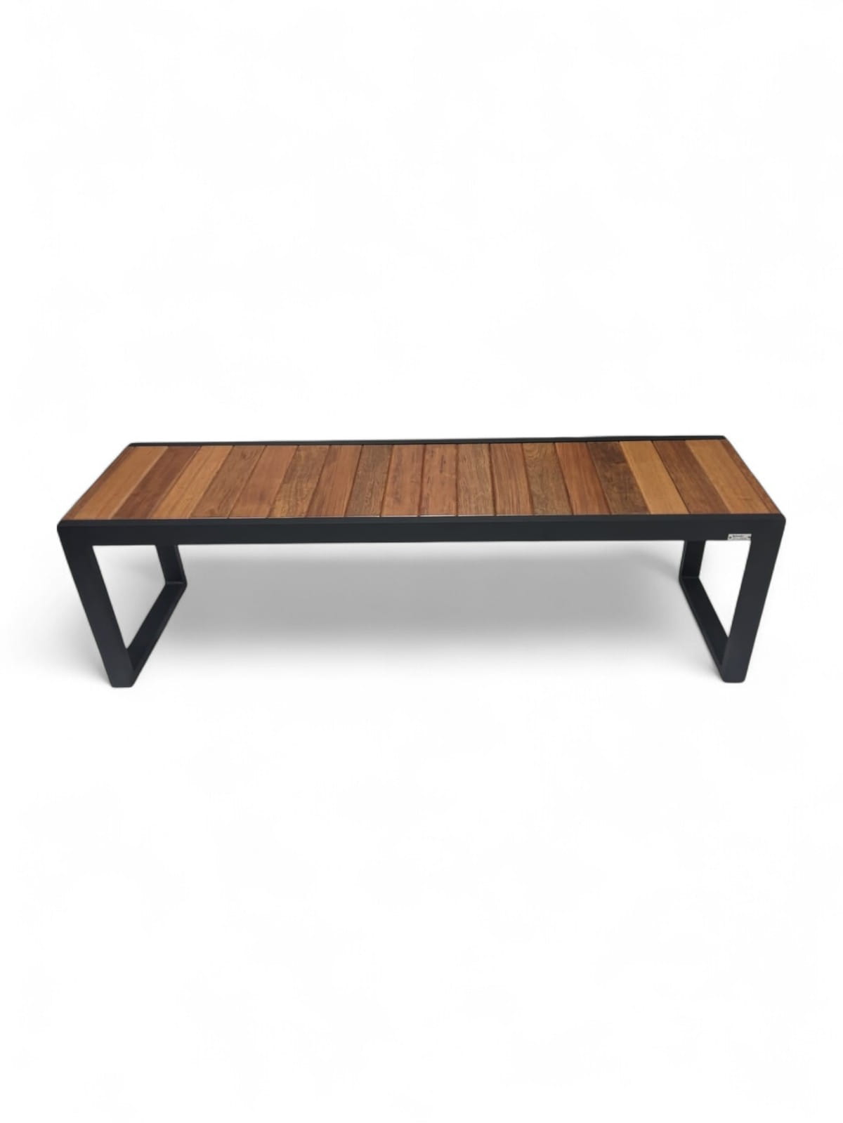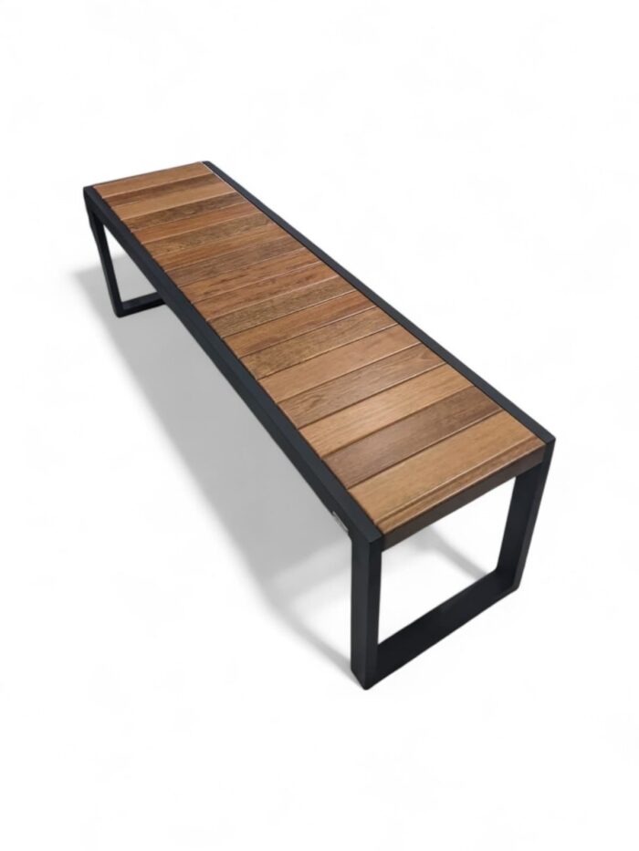 Sua estrutura é feita em alumínio com pintura eletrostática, garantindo leveza, durabilidade e proteção contra intempéries. O grande diferencial está no acabamento superior em madeira Jatobá, conhecida por sua beleza natural, resistência e tonalidade marcante, que confere um toque de calor e requinte ao design.