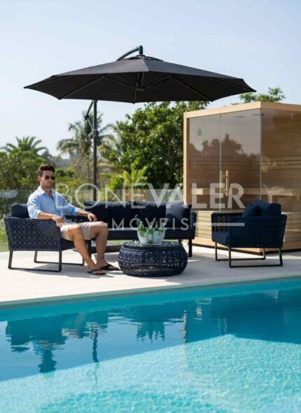 O Sofá Angra, uma peça que se destaca pelo seu design imponente e acabamento artesanal em tricô náutico tramado verticalmente, que confere leveza visual e um toque sofisticado ao ambiente. Sua estrutura em alumínio com pintura eletrostática garante resistência, durabilidade e leveza, ideal para ambientes externos. Os estofados em tecido Acquablock impermeável proporcionam conforto e praticidade, sendo fáceis de limpar e perfeitos para o uso ao ar livre.