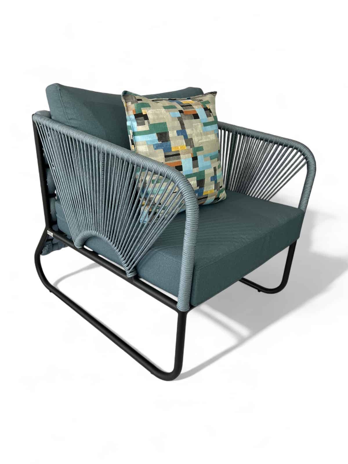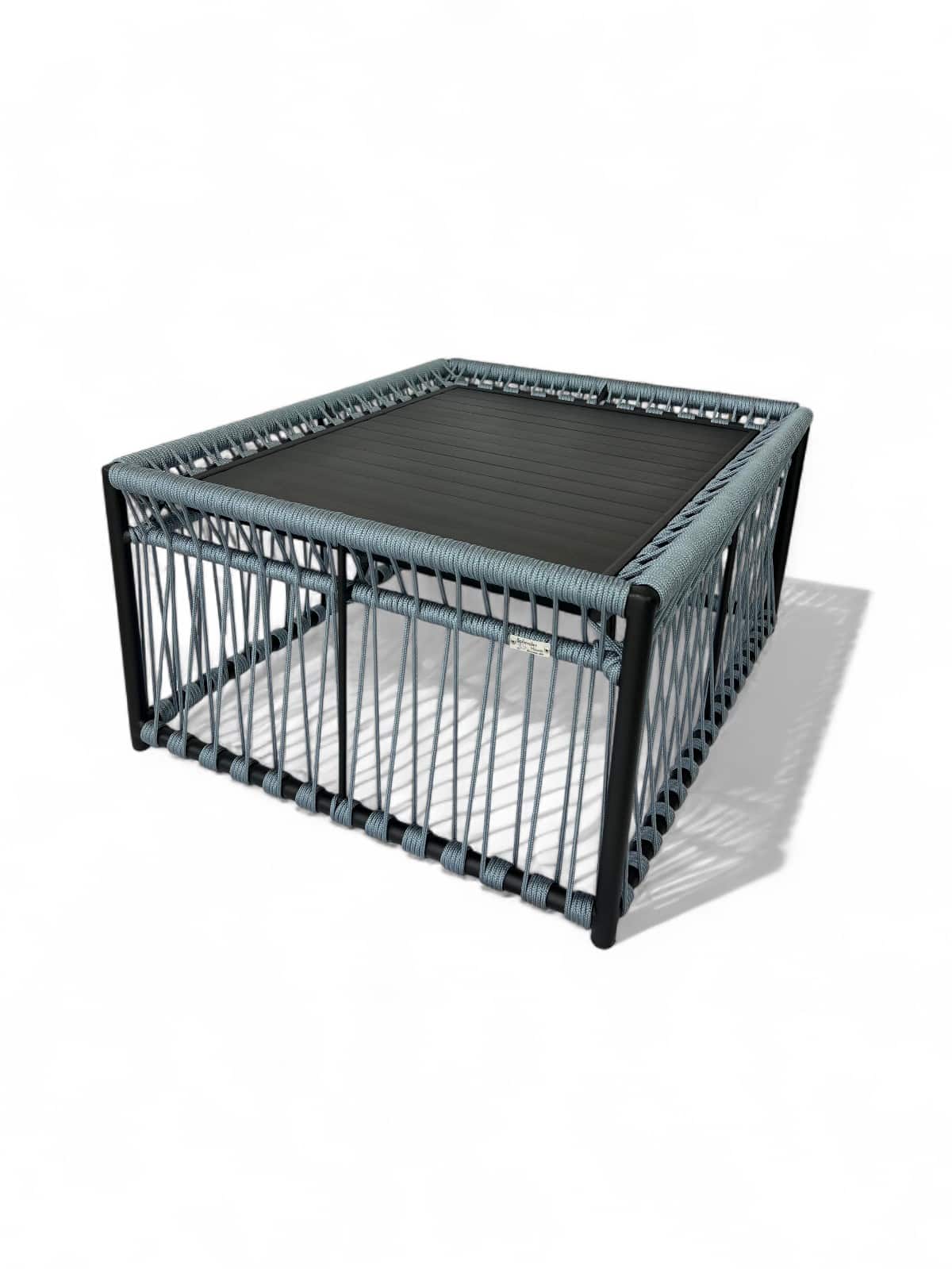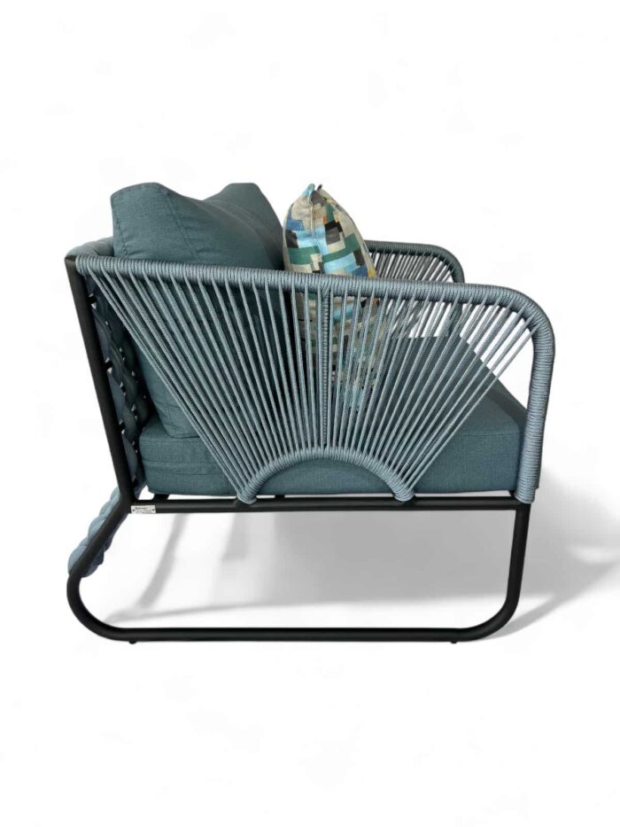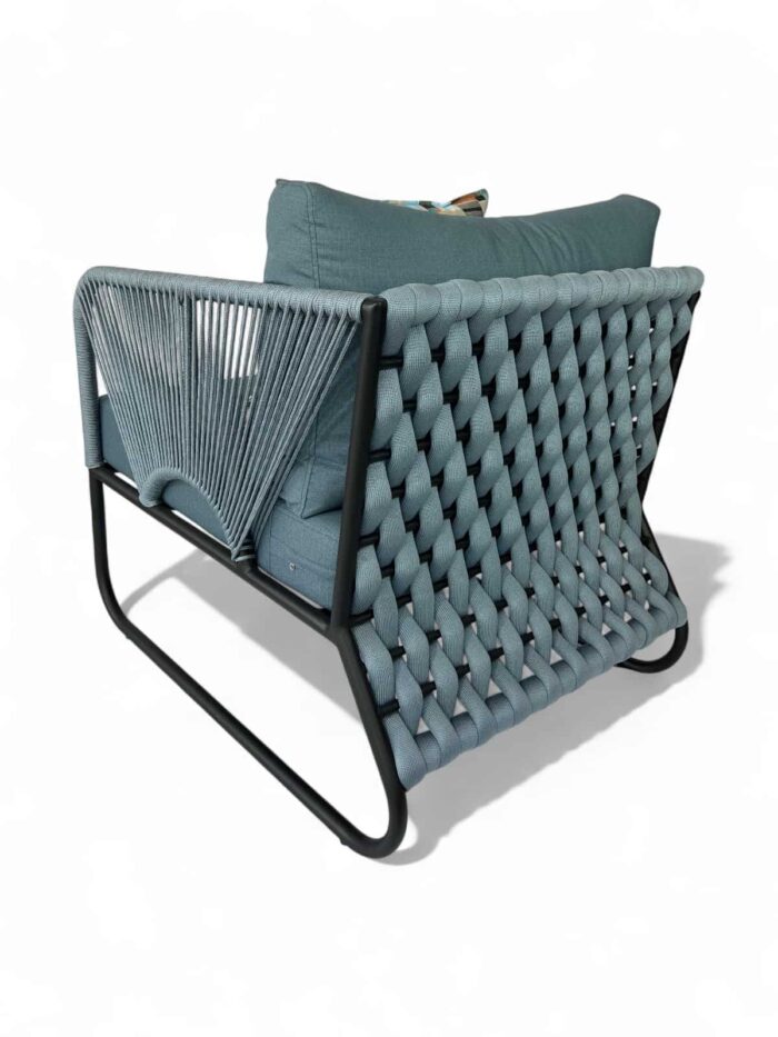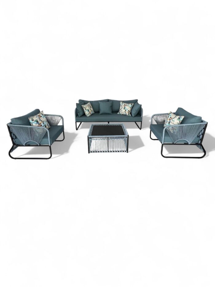 Composto por um sofá de 3 lugares, duas poltronas e uma mesa de centro, este conjunto se destaca pelo seu design único nas laterais, que valoriza o tramado artesanal em tricô náutico e corda náutica, criando um visual marcante e elegante.